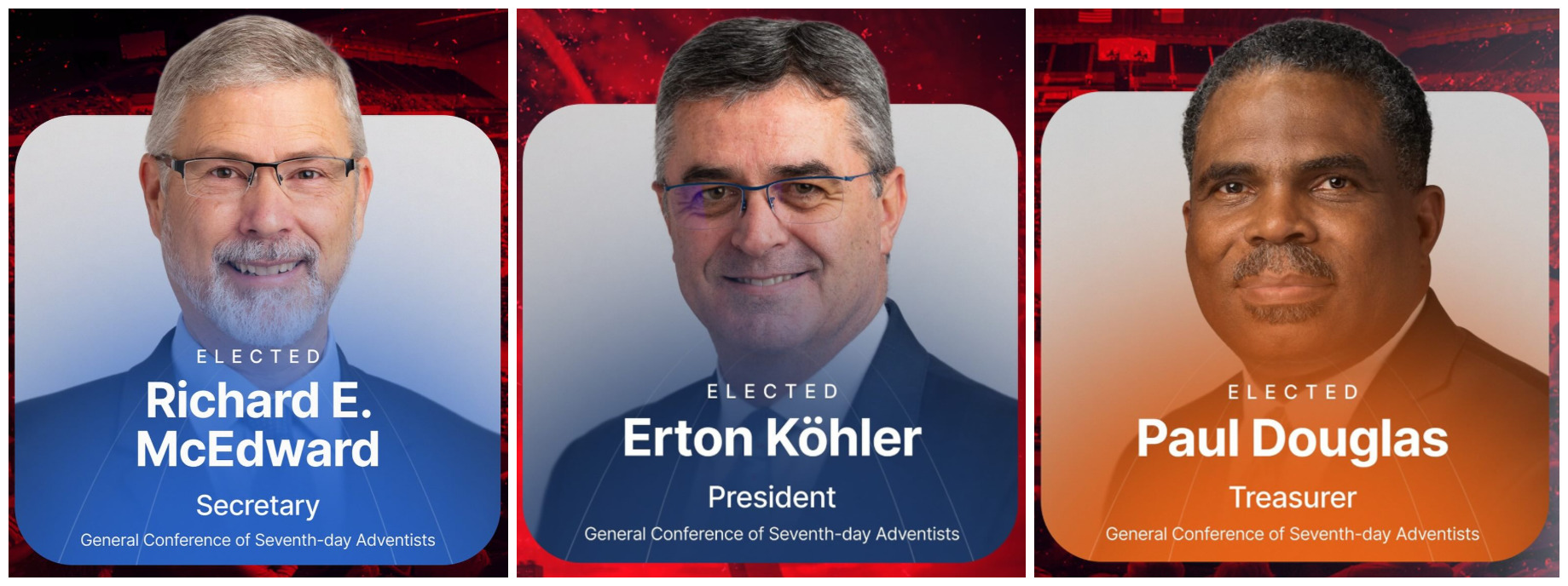 | WWW.ADVENTIST.ORG General Conference ![]() President of GC Pastor Pastor Erton Kohler Secretary Pastor Richard McEdward Treasurer Mr. Paul Douglas |